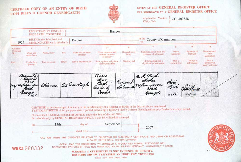 Rhianon Pugh, Born 1924, birth certificate