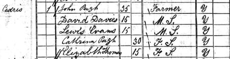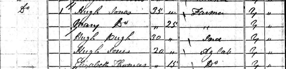 1841 census. Elizabeth had left home by now. Elizabeth, now fifteen, was likely to be working as a domestic servant elsewhere. There is an 1841 record of an Elizabeth Thomas aged fifteen being employed by Hugh Jones, a farmer at Tycroes in Llanfihangel Y Pennant. In addition to the same name and age, other circumstantial support for thinking this is our Elizabeth Thomas is that Rees's Elizabeth gave birth to an illegitimate daughter, baptised Margaret Jones in October 1846. Hugh Jones the farmer had an eligible agricultural labourer five years older than Elizabeth who was also named Hugh Jones. Sadly Margaret Jones died in January 1848.