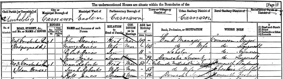 1871 census gives Rees Thomas' still unmarried daughter Catherine (head of household) as living at 14 South St, Dolgellau, with her also unmarried sister Mary. They are both housekeepers It is not known what happened to Catherine but Rees Thomas's daughter Mary was still at Fron Yw in 1881. The census also lists 23 year old dressmaker Eliza Jones, described as ‘boarder’. The unmarried Mary’s age is recorded as 46 and occupation ‘formerly cook’. It was at Fron Yw that Mary died on 23 August 1884 aged 50. She died in testate and the Letters of Administration for £147 were granted to her sister Sarah who by then lived in Iban House, Llanbeblig Road, Caernarfon. The husband Rev. Evan Roberts is reputed within the family to have 'fiddled the books' regarding Fron Yw!