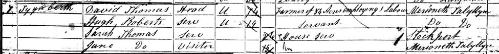 1841 census she is living with uncle and grandmother. 1841 census shows head of Household David Thomas, farmer aged 60, Sarah Rees age 85, David Roberts age 13 male servant, Sara Thomas age 16 female servant. In 1841 the rest of family lived in Tan'r Ewan (Under the Yew), later known as Tyriwen, one of two houses that backed onto the churchyard at Talyllyn.