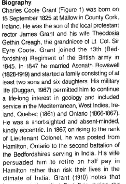 Lieutenant Colonel Charles Coote Grant (1825-1914). Grant was an eccentric Protestant Irishman, who served inthe British army in many countries, and ended up in Quebec (1861) and Ontario(1866-1867). In 1867 he was posted to India, but chose instead to retire from the army and settle with his family in Hamilton.He was a self-taught paleontologist who amassed important collections from Paleozoic rocks near Hamilton, and was a founding member of the Geological Section of the Hamilton Association