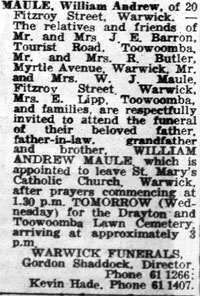 Funeral notice for Dorothy May MAULE (nee SEXTON, wife of of William Andrew MAULE) in Toowoomba Chronicle December 24, 1965.