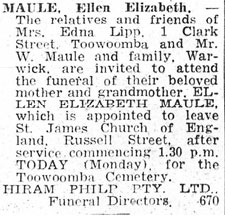 Ellen Elizabeth MAULE (nee GRANT/TALBOT) died 9 Aug 1969 aged 86, buried at Toowoomba Drayton Cemetery, Section Pres 1, Block R3 Allotment 18. Buried with her is her daughter Edna Elizabeth LIPP who died 27 Aug 1995 aged 82.