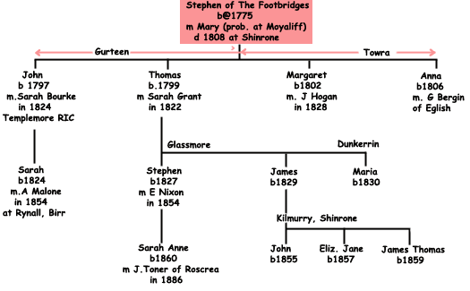 When he died in 1808 Stephen's address was given as The Footbridges, Shinrone. His widow Mary must have moved to Dunkerrin, their son Thomas was living at Dunkerrin. The Footbridges are apparently by the back gate of Milbroke House