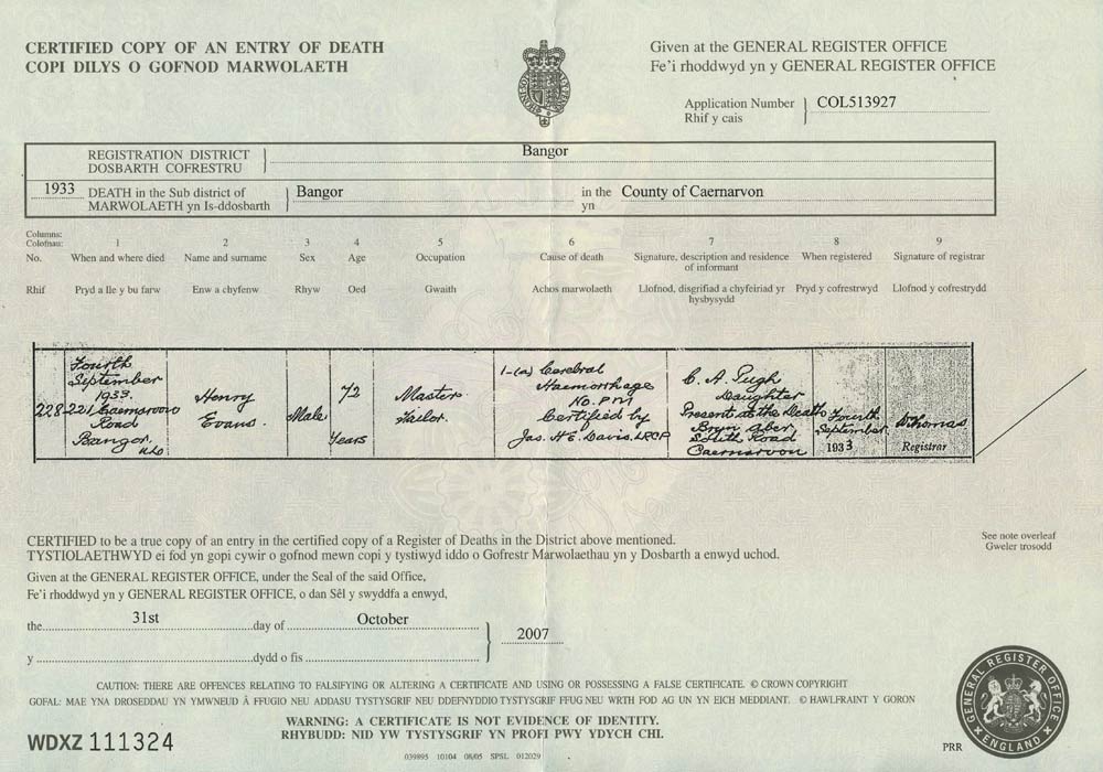 Henry Evans died 4 Sept 1933 age 72 at 221 Caernarvon Rd, Bangor